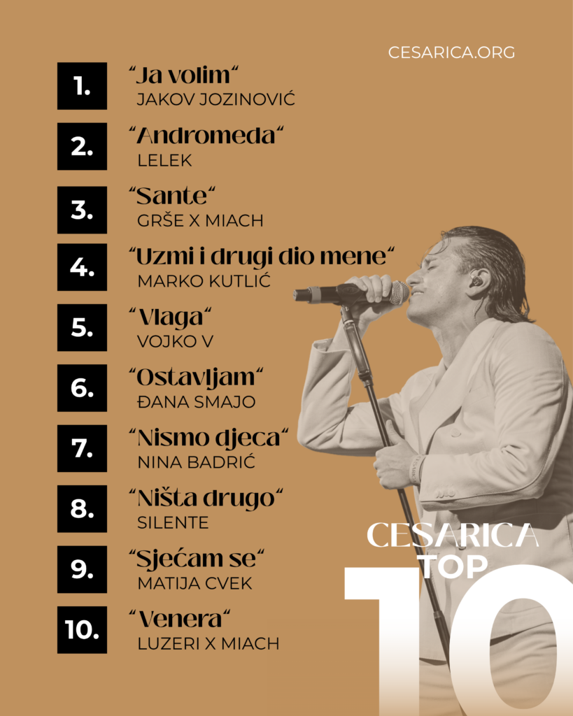Kroz osvježeni model praćenja uspješnosti pjesama, objavljen je prvi Cesarica Top 10 za razdoblje od siječnja do ožujka, koji otkriva koje su pjesme obilježile početak godine – ali i koje su već sada u ozbiljnoj konkurenciji za najveći hit 2026.